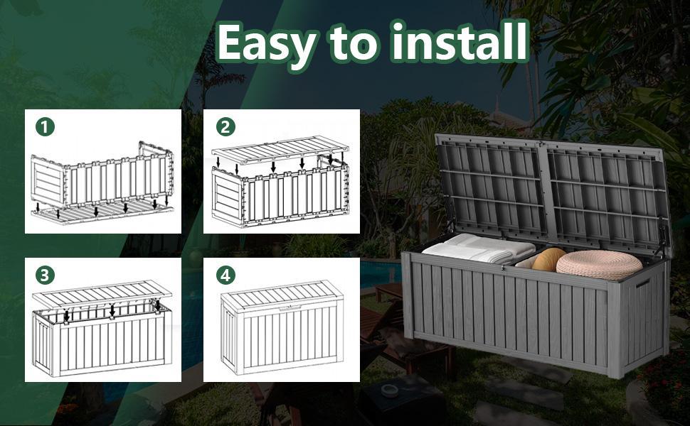 ● Tool-Free Assembly - The deck box is designed for easy assembly with no tools required, allowing for quick and straightforward setup. Ideal for Multiple Uses:Perfect for storing family party supplies, camping equipment, or gardening tools, this deck box meets a range of outdoor storage needs.