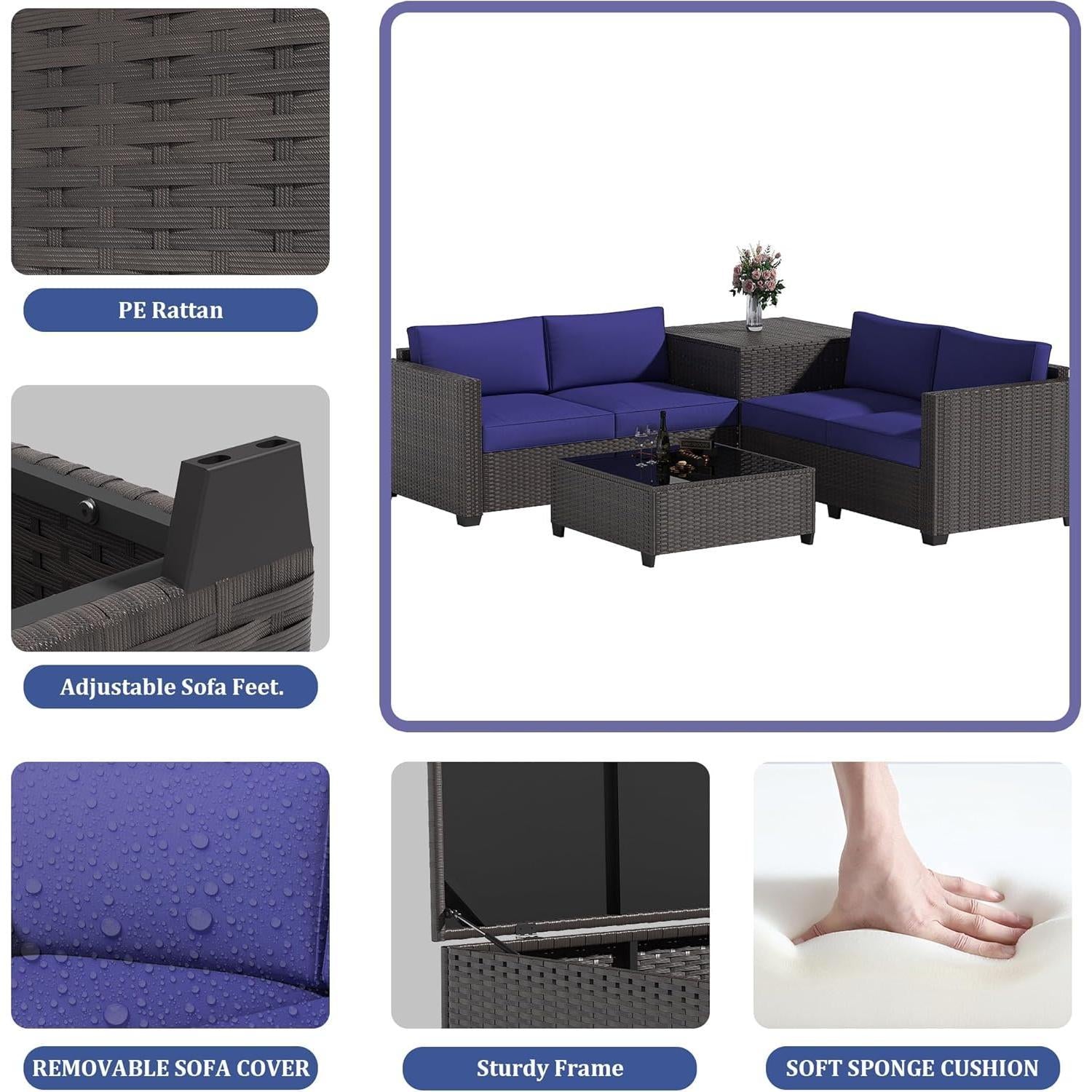 Yardgrace 4-Piece Wicker Patio Furniture Set, Sectional Sofa with Glass Coffee Table & Large Storage Box, Couch, Outdoor Conversation Set with Thick Blue Cushions